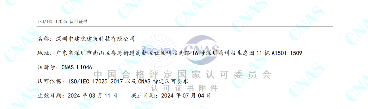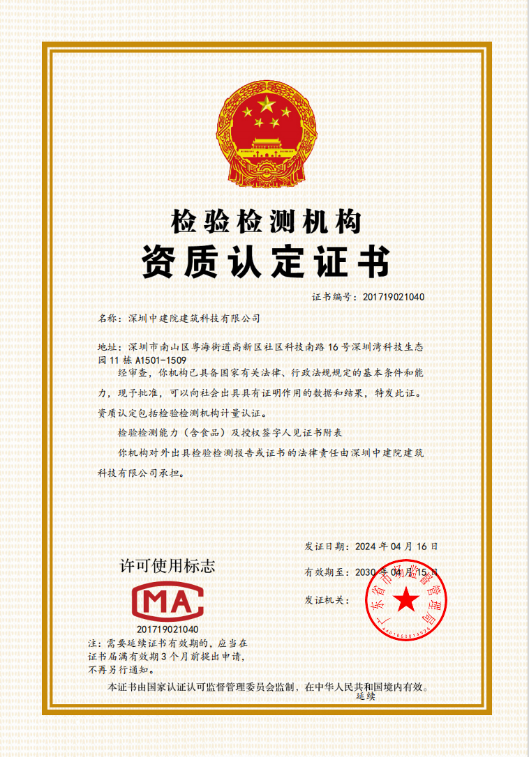 深圳中建院综合检测实验室建设工作进展顺利,建筑节能、绿色建筑新增项目已取得CNAS 、CMA资质扩项证书,幕墙实验室已完成设备主体安装工作,继续进行资质能力建设及部分新增项目扩项审核工作。