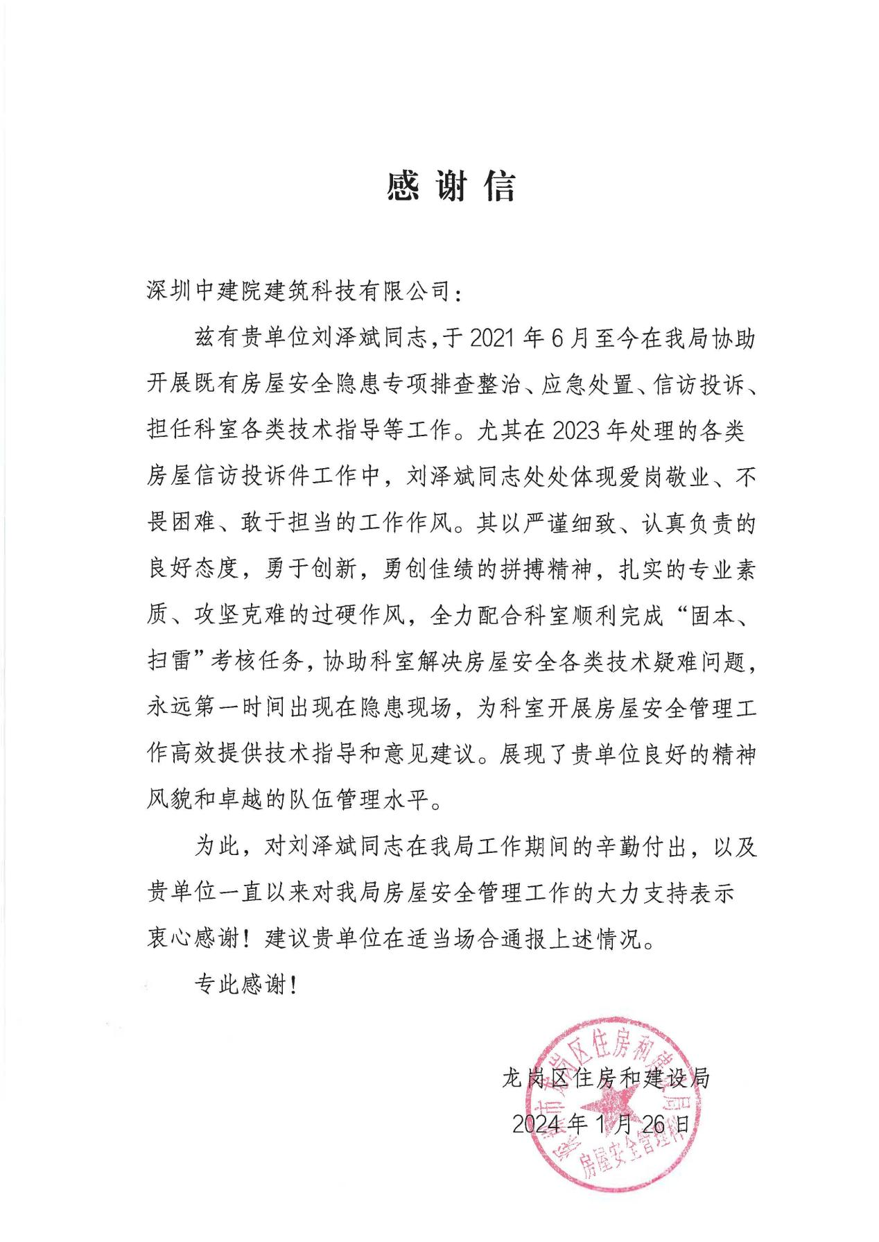 近期,深圳中建院建筑科技有限公司(以下简称“深圳中建院”)收到深圳市龙岗区住房和建设局发来的感谢信,对深圳中建院多年来在房屋安全管理工作中的大力支持表示感谢,对刘泽斌、陈思凝两位同志的辛勤付出提出表扬。