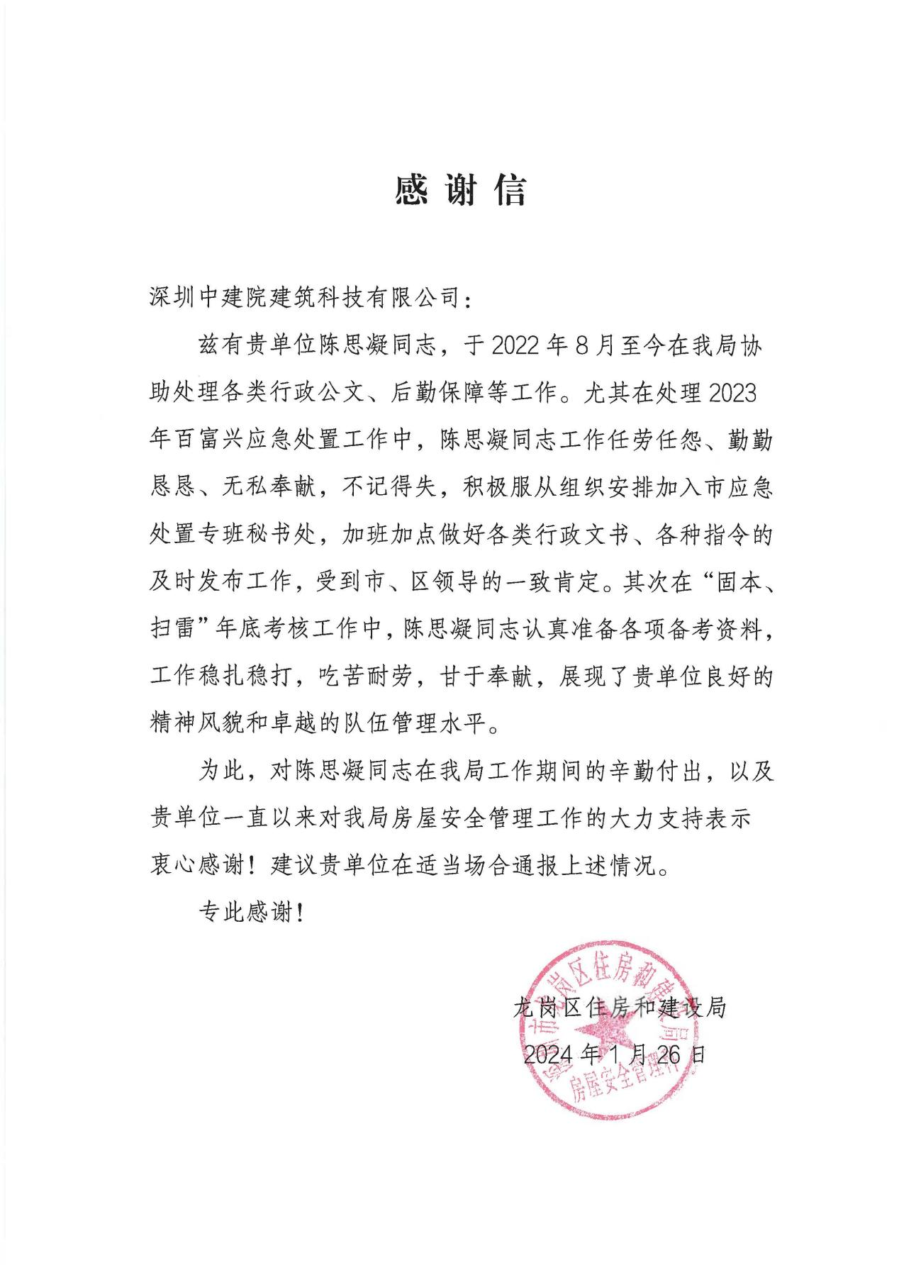 信中强调,深圳中建院驻点代表陈思凝同志以吃苦耐劳、不计得失的良好精神,协助处理各类行政公文、后勤保障等工作,积极服从组织安排加入市应急处置专班秘书处,工作期间的表现也受到市、区领导的一致肯定。