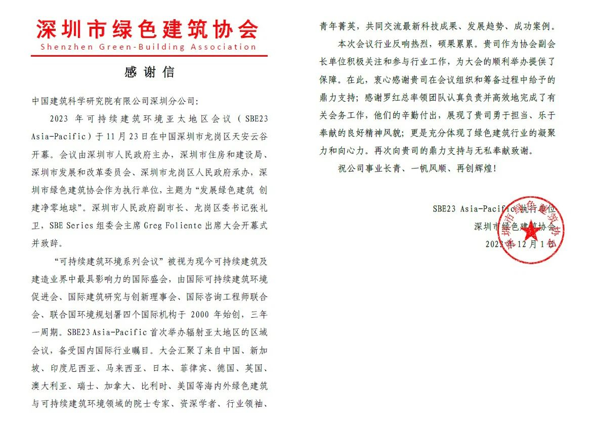 近期,深圳市绿色建筑协会向明升MS88·[中国]官方网站 深圳分公司发来感谢信,对明升MS88·[中国]官方网站 深圳分公司支持保障2023年可持续建筑环境亚太地区会议顺利举办表示感谢。