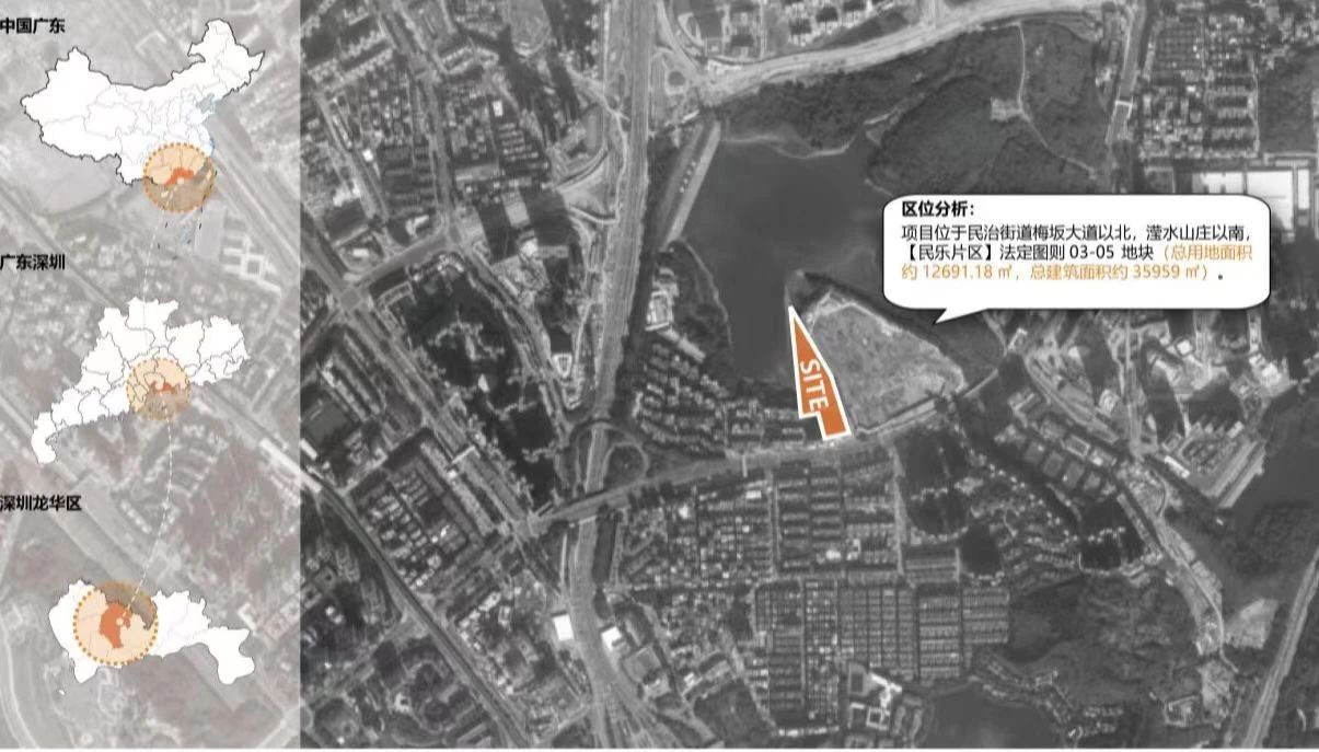 项目位于龙华区民治街道梅坂大道以北,滢水山庄以南。南侧、西侧和东侧为二类居住用地,北侧为水库水面。学校总用地面积12691.18平方米,总建筑面积约35959平方米,拟建设一所36班/1620学位小学。