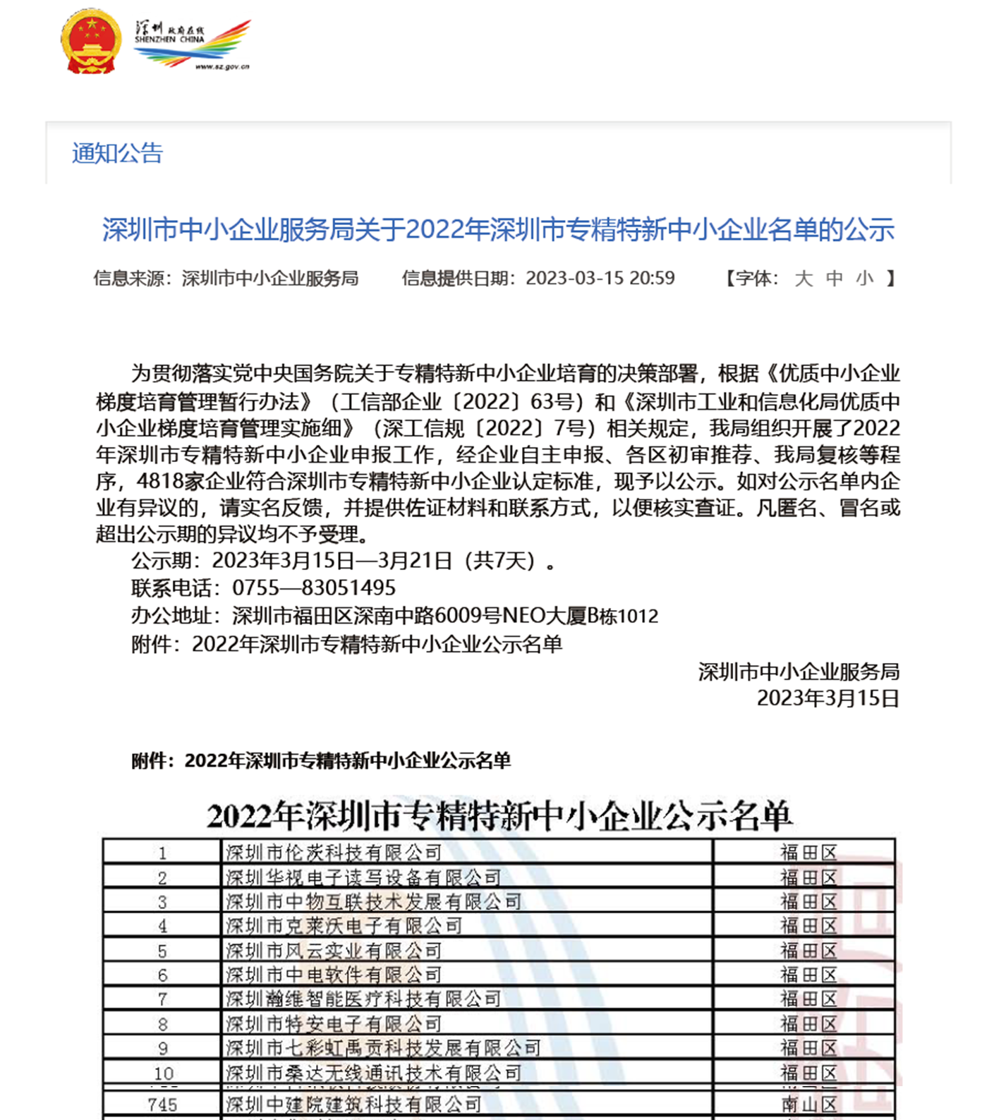 3月15日-21日,深圳市中小企业服务局对2022年深圳市专精特新中小企业名单进行公示,深圳中建院建筑科技有限公司(简称“深圳中建院”)获得深圳市专精特新中小企业认定。