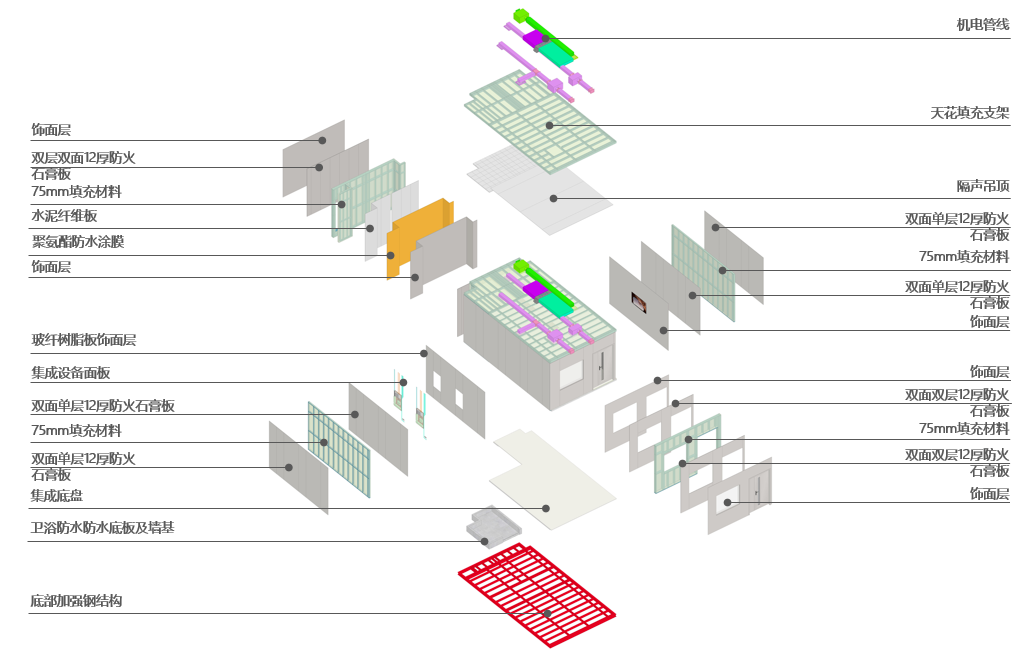 主体结构钢框架自成结构体系,并提供竖向承载及抗侧作用,工厂预制的模块化病房经现场吊装嵌入钢框架中。模块化病房自承重,其重量作为附加荷载作用于主体结构,不参与分担地震力作用。模块单元仅需满足自身结构稳定及吊装要求,其结构及节点构造简单,与主体框架的连接节点仅需满足基本传力功能。